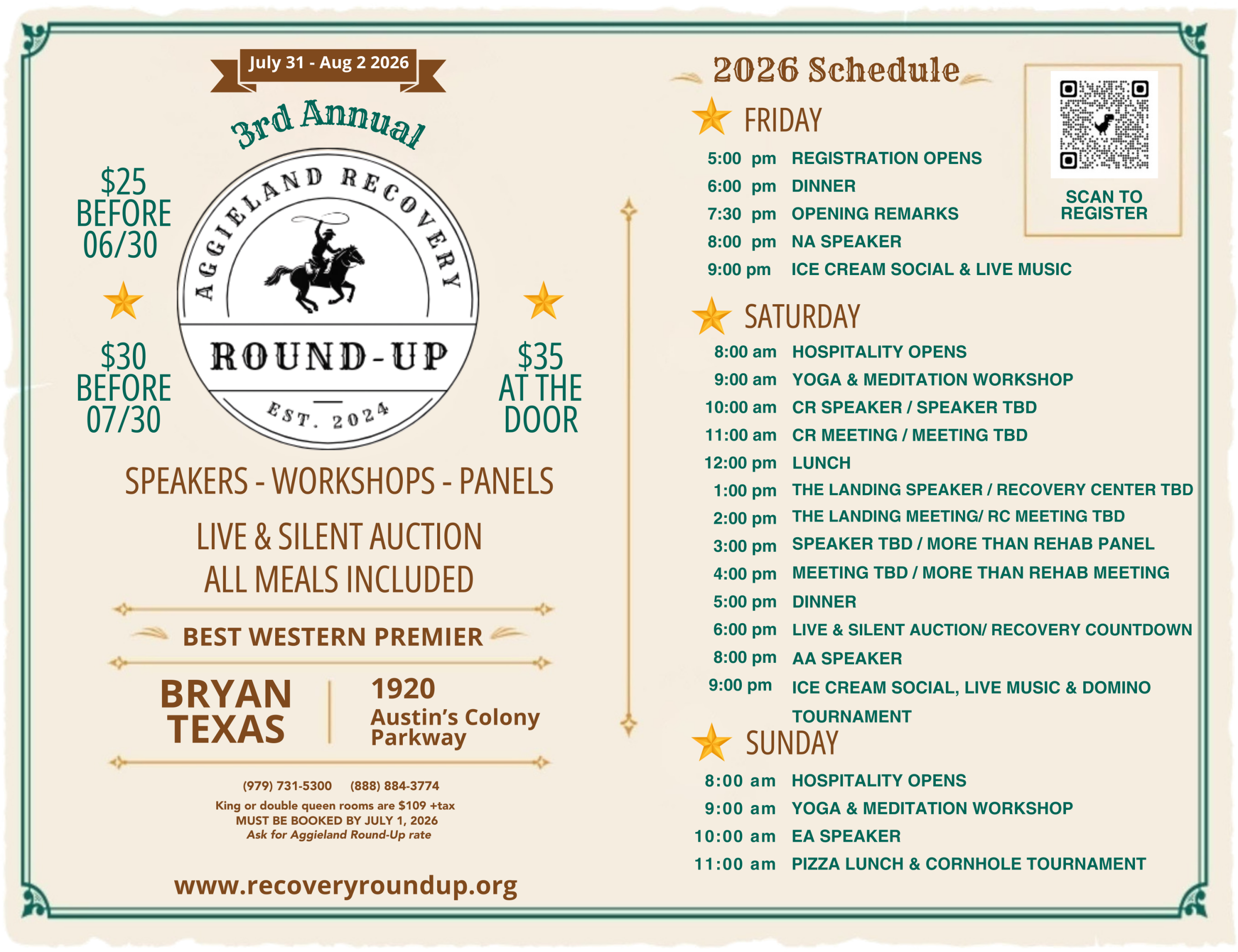 The 2026 Aggieland Recovery Round-Up is just around the corner! The purpose of the Aggieland Recovery Round-Up is to provide a platform to share a universal 12-step message of recovery based on the experience, strength, and hope of individual members of 12-step fellowships represented in the Brazos Valley.